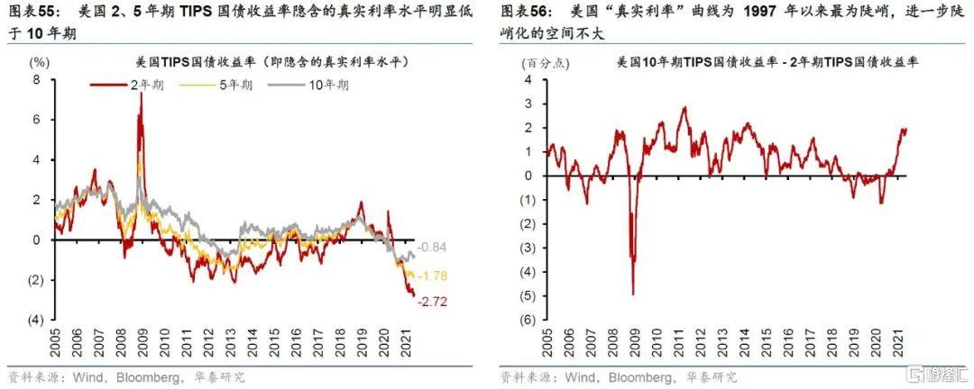 已经完美计入联储“鸽派”预期,实际利率曲线脆弱性上升。鉴于目前美债的真实利率曲线已经是1997年以来最为陡峭水平,即市场已经计入美联储滞后紧缩、极度鸽派的预期,所以真实利率曲线更为“脆弱”、尤其在短端和中端。随着通胀粘性兑现,即使联储保持鸽派,短端和中端利率仍将继续承压。具体看,目前美国TIPS国债收益率隐含的2、5年期真实利率分别为-2.72%、-1.78%,大幅低于10年期的-0.84%,美国2年与10年期真实利率之差也升至2014年3月以来的历史高位1.88个百分点(图表55和56)。