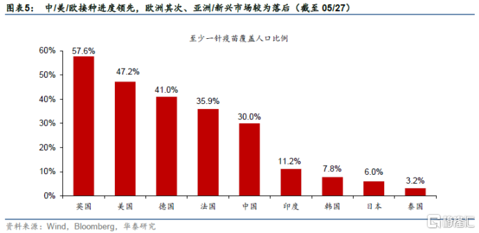 目前疫苗接种率美英领先,欧元区其次。截至5月27日,中国(接种率30%)、美国(47.2%)、英国(57.6%)、法国(35.9%)、德国(41.0%)中,我国是目前全球接种疫苗数量最多的国家、覆盖率也迅速提升;德国和法国的疫苗接种速度近期有所加快并维持在高位水平(括号内为各国总人口接种覆盖率)。按7天平均疫苗接种数增长趋势推算,预计美国(7月中旬)、英国(6月底)、法国(9月初)、德国(8月初)将陆续达到70%的总人口接种覆盖率(至少接种一剂),基本达到“群体免疫”标准。