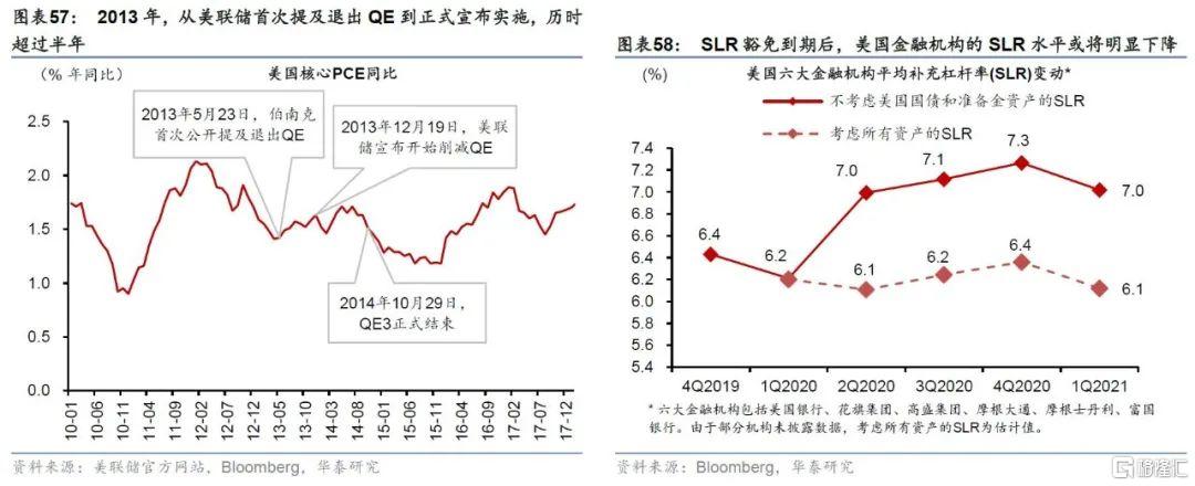 美联储大概率在2021年9月的FOMC会议上首次提及削减QE体量。鉴于这次新冠疫情引起的衰退幅度较大,且“供需错配”的情形短期较为突出,我们预计美联储削减QE(及以后加息)的决定会更加谨慎(图表57)。我们预计联储可能在9月FOMC会议上第一次传递缩减QE体量的信号,主要考虑以下几点:1)通胀的“基数”因素将在7月后消退,如果通胀仍有粘性,核心PCE仍将持续超出联储预期;2)三项联邦失业救济将于9月6日过期,包括覆盖没有资格获得普通失业救助的就业者的疫情失业补助(Pandemic Unemployment Assistance,PUA)、覆盖失业至少6个月的居民的疫情紧急失业补偿(Pandemic Emergency Unemployment Compensation ,PEUC)、以及每周300美元的普通失业救助。根据美国劳工部的数据,前两项救助申领者(在普通失业救助以外)有1000万人以上,届时会更有动力寻找工作,或将推动失业率进一步下行;3)2021年9月议息会议将第一次引入对2024年增长和通胀的各项预测,届时如果核心通胀预测仍然超过2%,核心PCE将连续4年超过联储2%的通胀目标,联储“双政策目标”的框架可能会受到严重挑战;4)2021年3月,联储宣布2020年4月推出的SLR考核豁免到期,即存款机构在计算SLR时需重新计入美国国债和准备金,这将推升存款机构的一级资本要求,压低其增持美国国债的空间(图表58)。