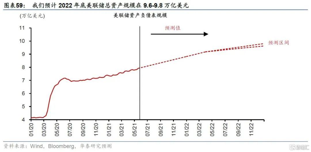 鉴于我们预计美联储可能在和市场沟通后保留半年左右的“缓冲期”,所以基准情形下,我们预计2022年4月联储开始削减月度资产购买计划至每月500-700亿美元。2021年年初至今,美联储资产负债表基本按照每月1200亿美元的规模扩张。按照此速度,我们预计2021年联储总资产规模为8.8万亿美元,同比增速从2020年的76.4%大幅放缓至19.8%,基本符合市场预期。如果联储从2022年4月开始削减月度资产购买规模至500-700亿美元,我们预计2022年底联储总资产规模在9.6-9.8万亿美元,相当于2019年底的2.3-2.4倍,同比增速进一步回落至9.2-11.2%(图表59)。