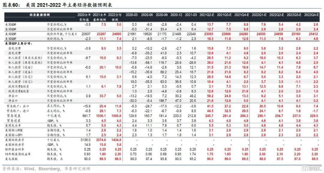 如我们在《高频跟踪:美欧环比增长如期再加速》(20210415)中所述,作为整体通胀的领先指标,总需求环比高增长印证通胀预期短期易上难下——随着3~4月数据公布,通胀上行粘性得到进一步确认、短期上行高度可能超出市场预期,目前较强需求+较高通胀的宏观环境可能有一定延续性。我们将美国2021年核心PCE均值预测再度上调0.2pct至2.6%、维持美国2021年名义GDP增速预测11.1%不变;预计2022年核心PCE均值及全年名义GDP增速分别为2.2%和7.4%。