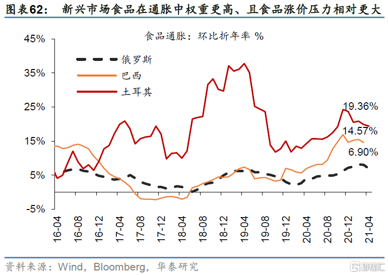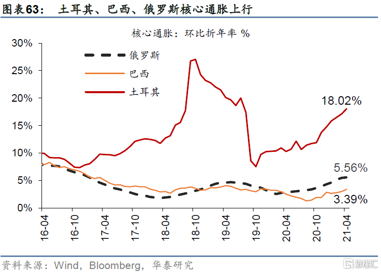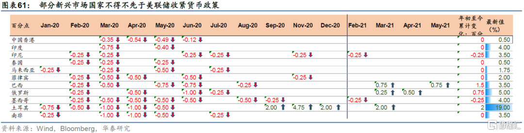 今年年初以来,随着美国增长和通胀快速升温,市场对美联储年内某个时点给出QE退出“路线图”的预期日渐浓厚,“QE缩减恐慌”对部分新兴市场国家的冲击再度体现。部分新兴市场——如土耳其、巴西、俄罗斯等国通胀大幅上行,主要原因是疫情影响下部分国家经济重启相对滞后,国内生产供应链无法有效保障供给带来的“供给冲击”;如我们在《通胀与美债利率齐升下的新兴市场》(20210331)中所述,为控制过高的通胀、及“提前”应对联储未来退出QE带来的资本流出压力,年初以来部分新兴市场国家不得不先于美联储收紧货币政策、进入加息周期(如图61所示):巴西(+150bps)、俄罗斯(+75bps)、土耳其(+200bps)均已大幅加息。