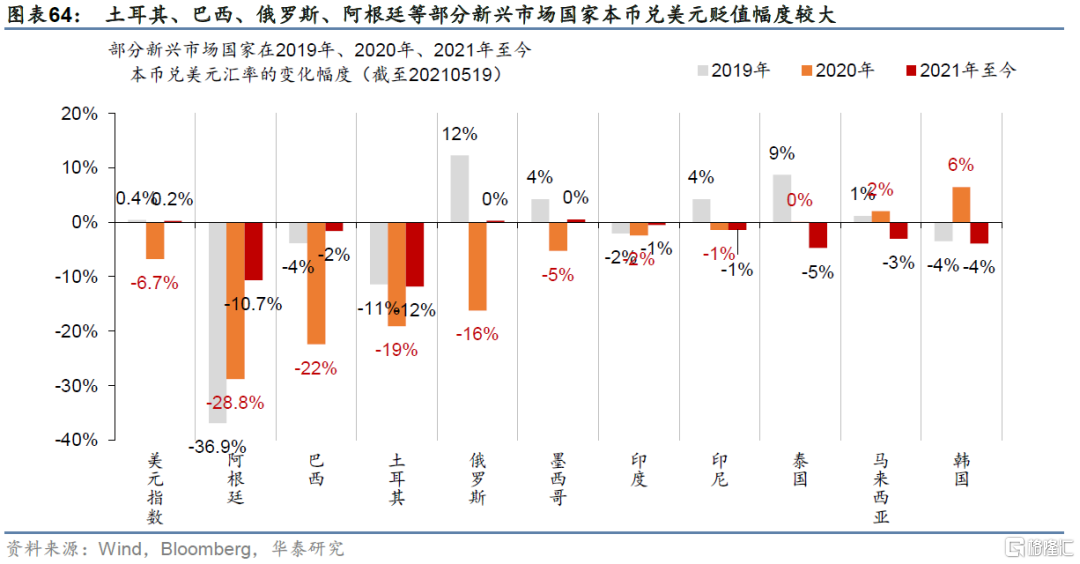 在本国产出缺口尚未弥合情况下,加息可能抑制经济回升、并加剧财政压力,形成财政与汇率脆弱性的“负反馈”(图表64)。美元利率上行下的资本外流压力加剧了本国货币收紧,而去年抗疫情背景下财政大幅宽松,加息周期势必大幅推升一些国家的财政赤字压力,形成财政与汇率脆弱性的“负反馈”。而如果在加息或维持利率水平不变之间“摇摆”,不利于形成稳定的货币政策预期,本币资产波动性可能加大——土耳其在3月份超预期加息后即是如此。