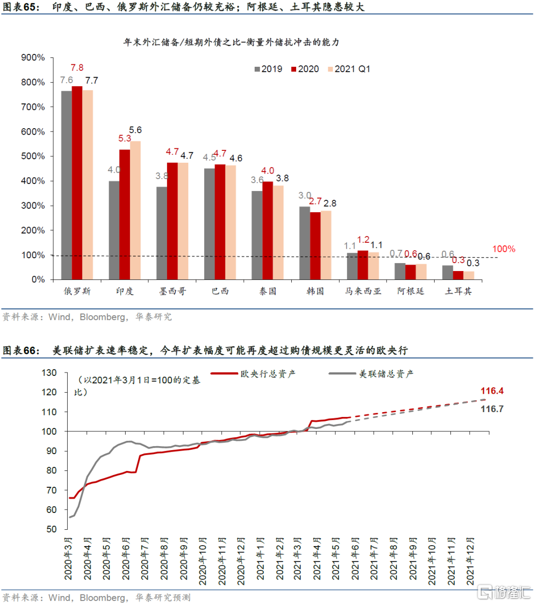 本轮相比2013-2015——有相似之处、但更有关键区别。当前新兴市场面临的困境与2013-15年“QE缩减恐慌”时的表征有一些相似之处,同样是美元流动性收紧推升部分新兴市场国家对外账户债务成本及资本外流压力。但如我们在《通胀与美债利率齐升下的新兴市场》(20210331)中的讨论,本轮QE削减周期也与2013-15年存在一些重要区别:一是全球经济重启,工业&制造业&贸易周期均上行,更支撑欧元日元而非美元;二是资源品和农产品价格均处于上行通道;三是疫情发展和疫苗接种将是各国经济基本面的重要决定因素;四是全球央行扩表速度均将放缓,2021年美联储相对扩表幅度可能仍然高于欧日。此外,因为疫情影响(对部分国家的冲击远未消除),本轮新兴市场可能面临更大的财政压力,部分国家财政收支平衡对利率的边际上升较为敏感。