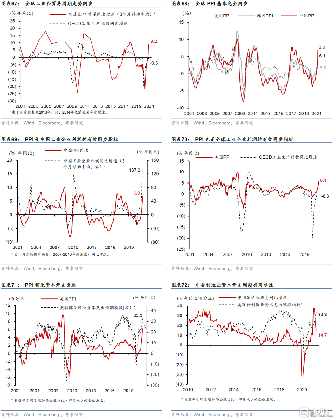 我们维持此前对全球贸易和工业周期回升有持续性的判断——继消费后,全球资本开支周期或成为新的增长“亮点”。虽然全球环比增长可能在2021年3季度冲高见顶,但短期被抑制的消费需求得以释放之后,我们继续看好全球的工业品价格、贸易和工业生产周期回升的可持续性(参见1月6日发布的《哪些“惯性”在2021可能被打破?》;图表67)。2020年下半年以来,全球PPI同步持续回升(图表68)。中外数据均显示,PPI是工业企业盈利增长和产能利用率的有效同步指标(图表69和70),并领先制造业资本开支周期1-2个季度(图表71)。考虑到各国制造业投资周期基本同步(图表72和73),我们预计全球贸易和工业周期在经历连续4年下行之后,可能首先迎来补库周期,此后展开温和的资本开支上行周期。目前,全球资本开支增长已经开始加速(图表72和73)。