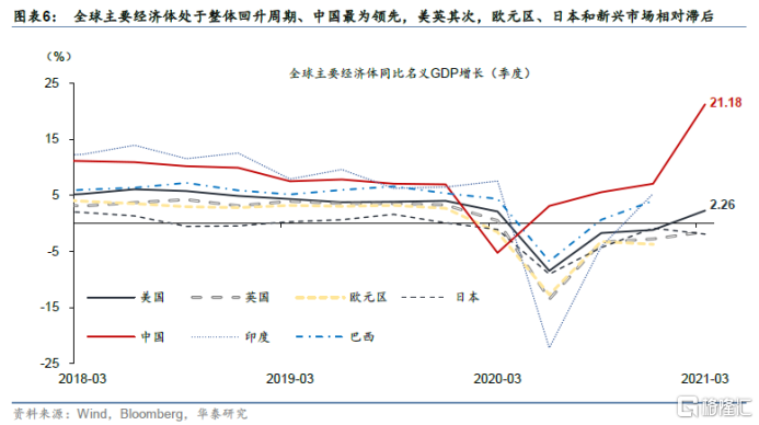 主要经济体当中,中/美/英疫苗接种领先(图表5),除中国之外(受疫情扰动很低),美英今年以来经济重启也较快;欧元区及日本重启进度落后美英约1个季度;中国以外的新兴市场总体而言重启更为滞后、尤其南亚和拉美(图表6)。——全球经济重启的行业结构特征表现为:制造业领先服务业、服务业当中内需重启领先国际往来。