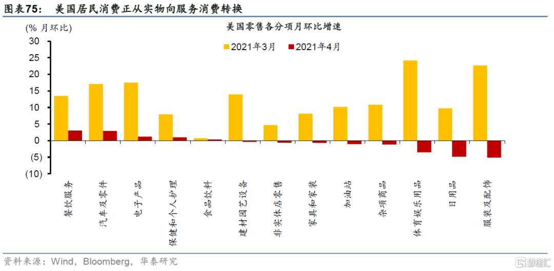 同时,全球消费的动能在重启过程中也可能从实物消费向服务消费转换,支持服务业增加值上升、资本开支回升、以及服务品通胀上升。近期美国消费数据显示,虽然汽车、电子产品、保健品等实物消费需求仍然强于加油站(出行)、体育娱乐用品等体验式消费需求,但餐饮、酒店、航空等服务业需求正在持续改善(图表75)。如上所述,我们估算2020年3月以来美国居民部门可能积累了约2.2万亿美元的超额储蓄,占2020年GDP的10.6%、居民消费支出的15.7%(图表41)。考虑到疫情前2019年服务业消费占美国居民消费支出的69.0%、GDP的46.8%,疫情缓和下超额储蓄释放有望带动可选消费、尤其是服务业消费回升、甚至出现“报复性反弹”。由于服务业供给恢复相对较慢,需求恢复或将明显推升服务品通胀压力,而价格和盈利修复则有望带动服务业资本开支回升。