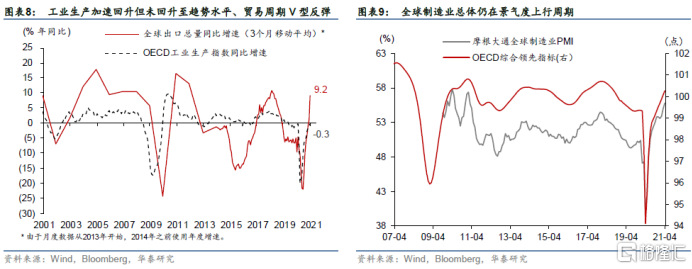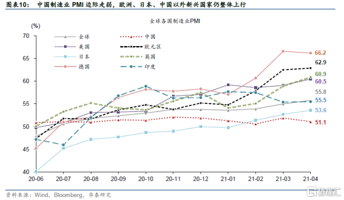 中美总需求仍有韧性,但环比增长最高的时点可能即将过去。中国制造业PMI年初以来震荡小幅回落;美国Markit制造业整体PMI(5月)仍在高位,但4月ISM PMI产出、订单、就业等分项已开始边际走弱(图表12)。尽管新一波疫情可能使得印度、东盟等新兴市场重启再遇挫折,但参考韩国出口的持续强势表现,国内疫情控制较好的新兴市场国家,在全球贸易周期回升过程中受益仍然较大。