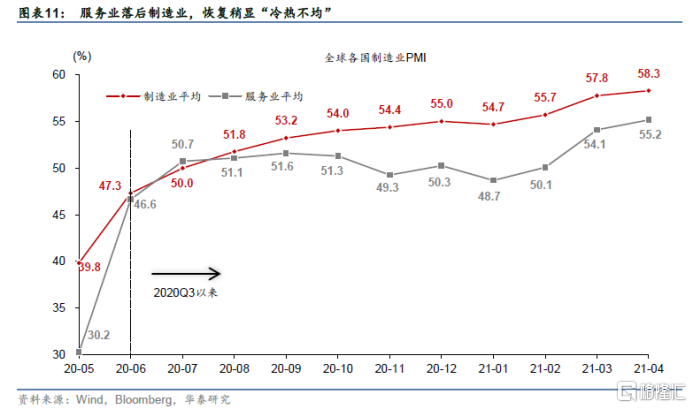 中国制造业PMI、以及美国制造业产出/订单等PMI分项已开始边际走弱,但欧洲、日本、中国以外的新兴市场还处于总体上行阶段。全球贸易和制造业周期处于整体回升周期当中(图表8~9);“拜登刺激”不仅提振美国本身的消费、生产、通胀预期,财政刺激的外溢效应(贸易角度)也拉动欧洲制造业预期大幅好转。与美英疫情的边际缓解、以及美国年初以来两轮财政刺激相应,主要经济体制造业PMI、以及韩国出口等制造业/贸易指标从3月以来大幅走强。摩根大通全球4月份制造业PMI(55.8%)和新订单(56.7%)都是近10年来的高位;欧洲和日本制造业大幅走强,欧元区(56.9%)、德国(64%)、法国(59.2%)、英国(66.1%)、日本(53.6%)最新一期制造业PMI均在近10年来的高位(图表10);相比之下,服务业改善稍显冷热不均,全球服务业PMI表现明显弱于制造业(图表11)。