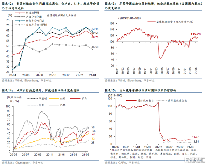 制造业领先服务业、服务业中内需重启领先国际往来。年初以来,欧美国家制造业订单明显加速,工业领域供不应求。欧美制造业新订单(2-3月数据)呈现大幅好转,信息技术产品(芯片等)和资本品(房屋等)新订单金额都已超出2019年同期。欧洲国家服务业从5月初开始加快重启,但涉及跨国协调/营运的商贸、旅游、就学等活动短期尚难恢复至疫情前水平,出入境隔离等摩擦性因素仍难以消除(图表15)。
