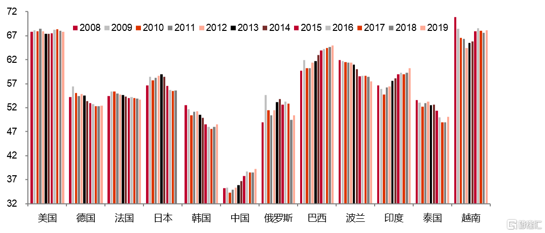 如果把我國最終消費進一步拆解為政府、企業和居民部門的最終消費,則居民部門與其他國家的差距更加明顯。如2019年我國居民的消費率只有39%,但印度為60%、越南為68%。