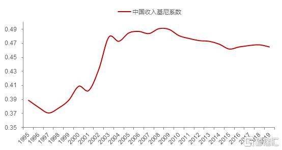 從下圖中可以看到,反映我國居民部門收入差距的基尼係數自上世紀90年代末開始上升,如今雖略有回落,但還是處在0.46的較高位置,與日本長期維持在0.35左右相比,明顯偏高。這或許可以解釋為何中日都是受傳統儒家文化影響較深的國家,但日本的消費率大大超過我國。