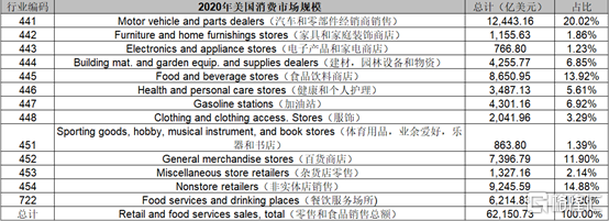 汽车和零部件销售1.244万亿美元,占比高达20.02%,加上汽油销售4301.16亿美元,占比6.92%,两项之和为26.94%