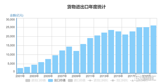 但是从图上看,可以很容易看出2012年出口金额突破两万亿美元之后,出口就遇到了瓶颈,增长速度大大放缓,这显示国外市场是不可能无限的让你做大的,别人对你开放了市场,你是需要拿出东西来交换的。