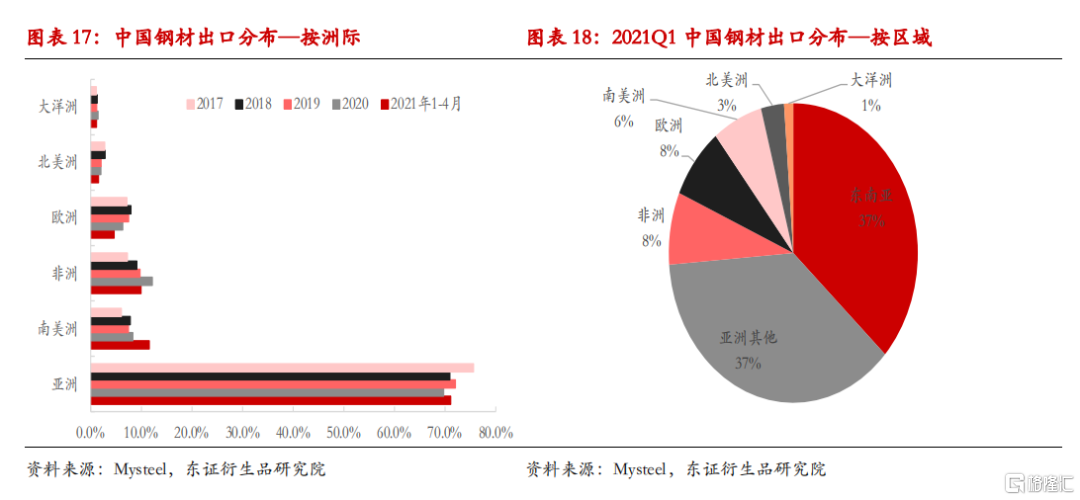 东南亚市场:东南亚市场是全球钢材贸易最重要的市场,占全球钢材贸易量的一半。其中,东南亚市场主要出口国为:中国、韩国、日本、越南、印度等。其中,日本钢材出口以高端材为主,规格集中制造业和汽车用钢,市场相对垄断;而中国、韩国、越南、印度等在热卷、冷轧、镀锌等品种上存在一定竞争。