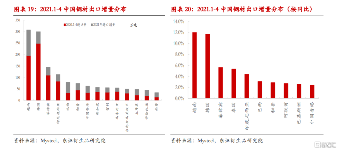 从增量上看,2021年以来,钢材出口增量最多的国家和地区分别为越南、韩国、巴西等国家。其中,对越南出口增量1-4月份以来增加112万吨,同比增长58%;韩国累计增加52万吨,同比增长21%;巴西累计增加46万吨,同比增长139%。