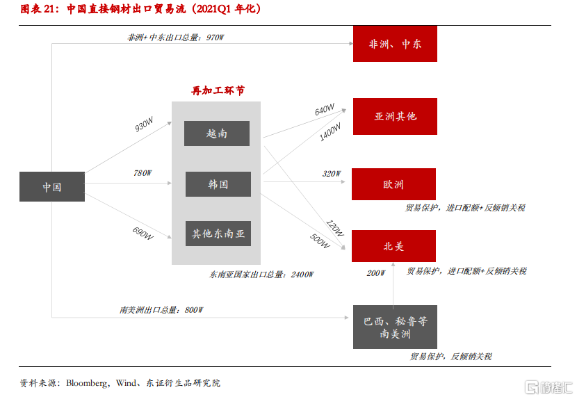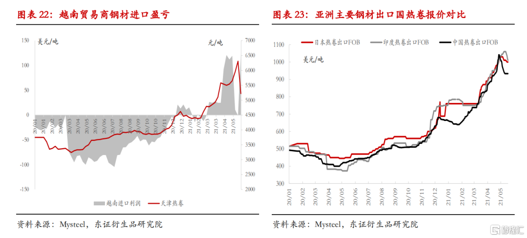图18是笔者根据国内钢材直接出口贸易梳理的物流图。随着部分制造业向东南亚国家转移,东南亚逐渐成为中国之后全球制造业中转地。以越南为首的东南亚国家通过进口原料和半成品,加工成终端消费品后出口全球。从钢材角度来说,越南等东南亚国家可以定义为我们的一个大型下游加工环节。跟国内各类压延厂、终端汽车家电等并无本质区别。因此,东南亚供需情况短期直接影响中国钢材实际出口订单。因此,从直接出口角度,短期钢材订单更多取决于亚洲进口国消费量和其他亚洲出口国的生产情况。对应监测指标包括:越南、韩国等贸易商钢材进口盈利窗口;越南、韩国等钢材直接出口量等。