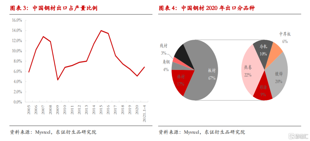 2021年以来,黑色市场核心定价逻辑在于两点:外需恢复和中国控产量政策预期。随着国常会反复点名大宗商品价格泡沫,控产量政策预期大大削弱,钢材自身的基本面逻辑更为重要。要解决外需是否能定价,在什么条件内能定价,主要难点在于对外需的定量。作为大宗基础原材料,钢材出口可以分为两个层面,直接出口和通过下游产品的间接出口。历史来看,中国钢材出口占全部粗钢产量比例不高,多在5%-10%之间。2013-2015年期间,国内需求恶化,被动出口海外缓解国内压力,当年出口占比最高10%。今年以来,最明显的差异在于,今年的出口订单为海外高溢价下主动出口。