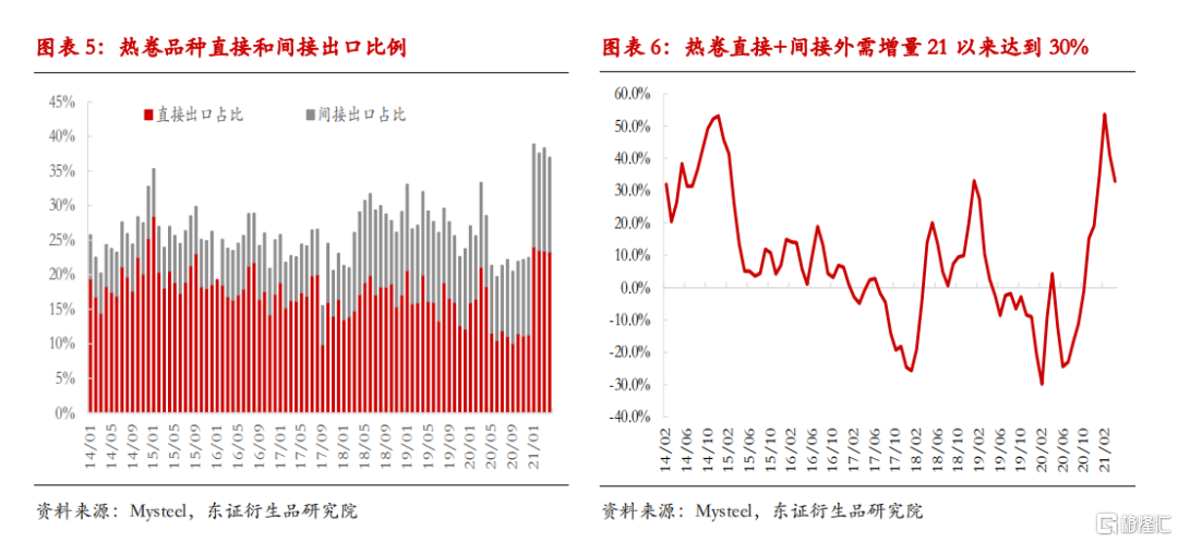 可以看到,包括家电、机械、汽车等出口需求占比分别达到50%、20%、6%。通过下游主要商品出口量用钢规模折算,2021年1-4月,热卷直接和间接钢材出口量比例达到了38%,较2019年同期累计增长24%。即,外需对于热卷需求的同比拉动在9%(38%*24%)。