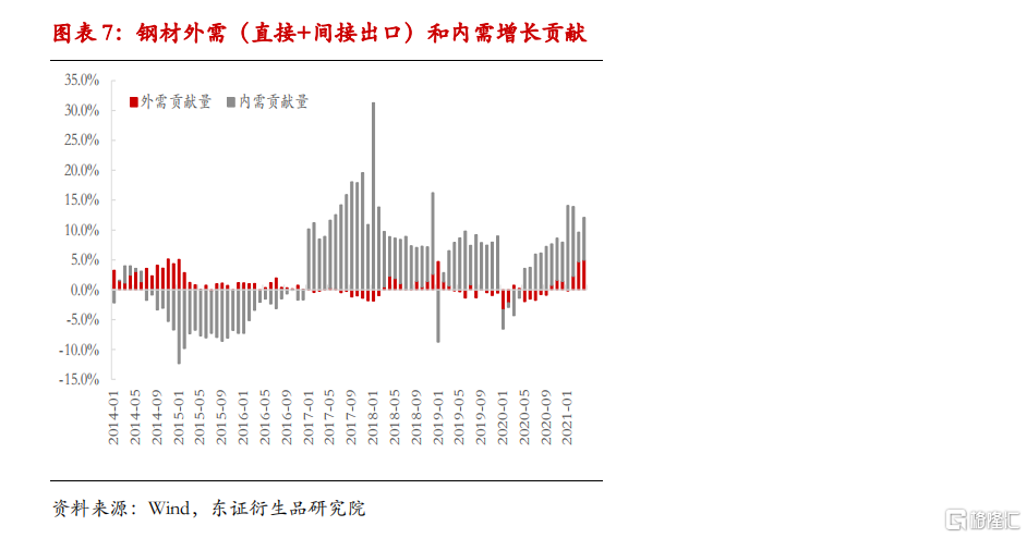 钢材品种中,35%为板材,75%为长材、型钢、管材等。假设钢材总需求为粗钢表观消费量,外需终端产品主要使用板材,长材管材多用于内需。以热卷外需比例直接推算板材整体外需比例后,中国钢材需求内外拉动比例如图7。从下图可以看到,2021年以来,外需对全国钢材拉动比例逐渐走高。以4月份单月数据来看,外需对全部钢材需求拉动比例约5%,内需拉动比例约7%(均同比2019年)。