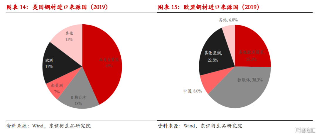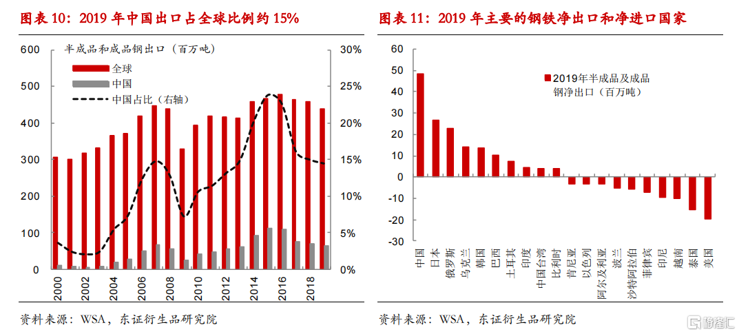 全球钢材贸易市场约4亿吨,占全球粗钢产量的20-25%。考虑2020年疫情影响,我们用2019年全球进出口数据进行分析。2019年中国占全球钢材出口总量的15%,其次为日本、韩国、俄罗斯和欧盟,分别占比7.8%、7%、6.9%和6.5%。进口方面,2019年全球最大钢材进口国家和地区为欧盟,占全球贸易比例近10%,其次为美国、泰国、韩国和中国,分别占比6.4%、4%、4%和3.6%。贸易品种上,全球贸易量中53%比例为热轧涂镀,钢坯半成品、长材比例也分别占14%和14%。