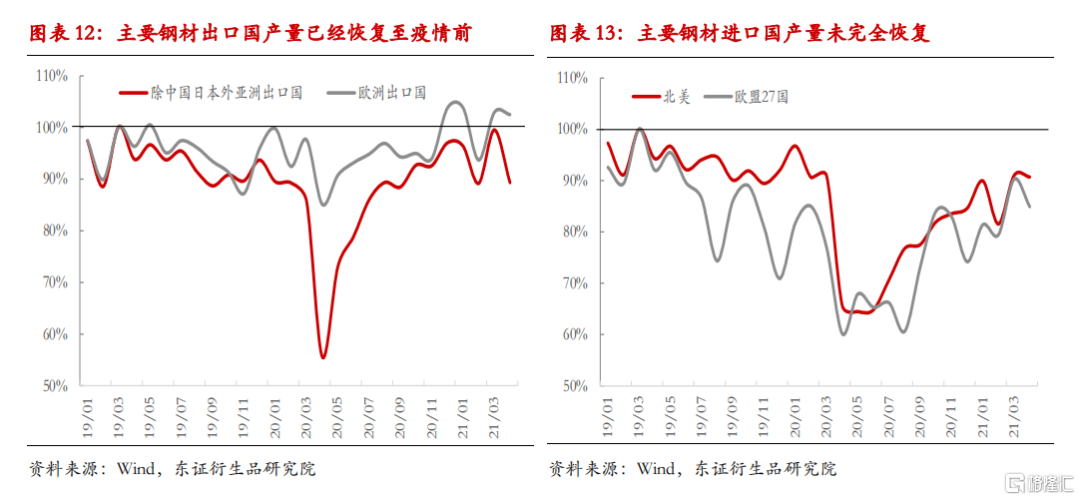 从区域性贸易供需角度看,包括中国、韩国、越南、印度、土耳其、俄罗斯等钢材出口国的粗钢产量均已恢复至疫情之前。北美、欧盟等钢材进口国产量始终未能达到2019的水平,意味着这部分地区粗钢产能可能出现永久性退出。欧美等消费品需求复苏,供应端高摩擦成本+部分供应永久性退出,导致全球进口贸易端钢材呈现缺口。