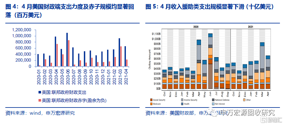 市場回顧:美聯儲延續擴表節奏同時疊加負債端TGA“泄洪”,由此導致流動性向準備金及隔夜逆回購兩大科目聚集。自2月中旬以來TGA存量快速壓降,而隔夜逆回購用量自3月以來快速提升,兩者相關度較高;而從自年初以來累計變動規模看,截止6月2日最新數據,美聯儲總資產較年初增加約6000億;負債端流通貨幣增加約900億、隔夜逆回購增加4400億、TGA減少8000億,最終導致儲備金存量增加7000億。由此可見,儘管美聯儲維持QE節奏不變、同時TGA資金開始釋放,但大量流動性並未湧入實體,反而是進入了隔夜逆回購及準備金這兩大科目。儘管TGA資金釋放屬於情理之中,但實際財政支出節奏並未大幅超出預期,拜登1.9萬億刺激在4月後支出力度顯著弱化。從3-4月實際數據來看,當前美國財政支出力度及赤字規模較2020年二季度峯值明顯偏弱,尤其4月赤字規模為2256億、較3月6596億明顯回落,其主要原因在於拜登計劃中對居民救濟的直接投放大多在3月完成,後續支出力度將大幅弱化。