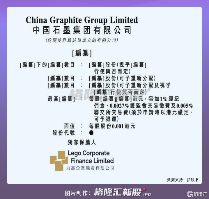 港交所信息显示,6月1日,中国石墨集团于向港交所提交上市申请书,拟香港主板上市。Lego Corporate Finance Limited(力高企业融资有限公司)为其独家保荐人,普华永道为其审计师。