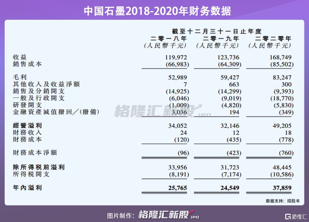 具体财务数据上,2018-2020年,中国石墨全年收入分别1.2亿、1.24亿和1.69亿元;净利润分别为2576.5万、2454.9万和3785.9万元;毛利分别约为5300万元、5940万元及8320万元,分别占毛利率的约44.2%、48%及49.3%。