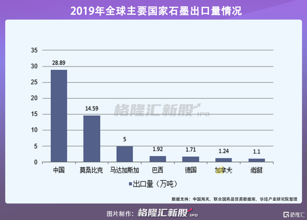 据统计,2019年中国石墨产量为125万吨,占全球产量的74.6%。以28.89万吨的出口量占世界第一,占世界石墨出口量的52.7%。