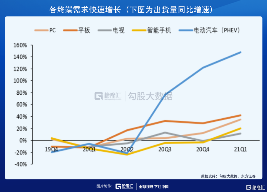 自去年下半年开始,由于疫情带来远程办公、远程教育的需求快速增长,这就带来消费电子(包括手机、电视、电脑等)等出货量大幅上升,同时新能源车也进入了爆发期,据统计,2021年Q1新能源车的销量同比增加150%。