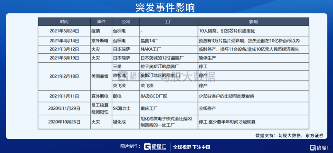 另外,在供给端,去年和今年又有不同的意外事件,导致市场缺芯更加严重,比如: