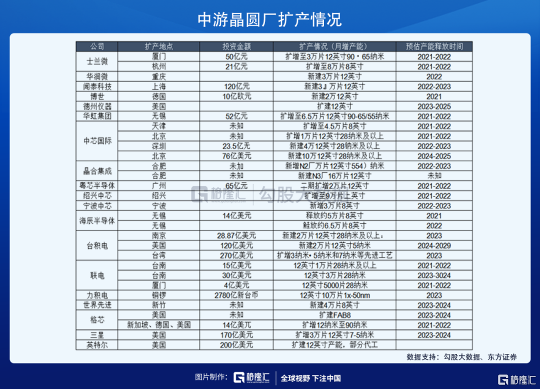 虽然目前几乎所有的晶圆代工和IDM公司的产能都已经打满,但依然无法满足去年以来大幅增加的下游需求。因此,在这种情况下,各大晶圆厂纷纷加大资本开支,进入大规模的扩产阶段。