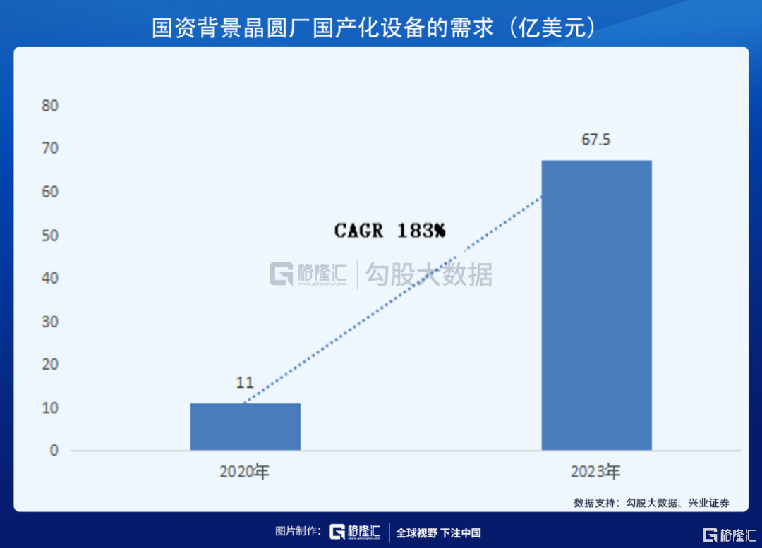 2020年,上述说的几家中游制造公司对国产设备的需求空间在10-12亿美元左右,2023年将达到65-70亿美元,年复合增长率为183%。