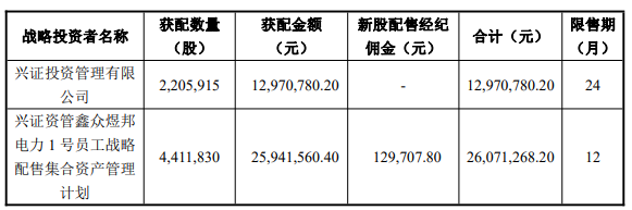 (一)战略配售情况本次发行的战略配售由兴证投资管理有限公司和兴证资管鑫众煜邦电力1号员工战略配售集合资产管理计划组成。各战略投资者实际认购结果如下: