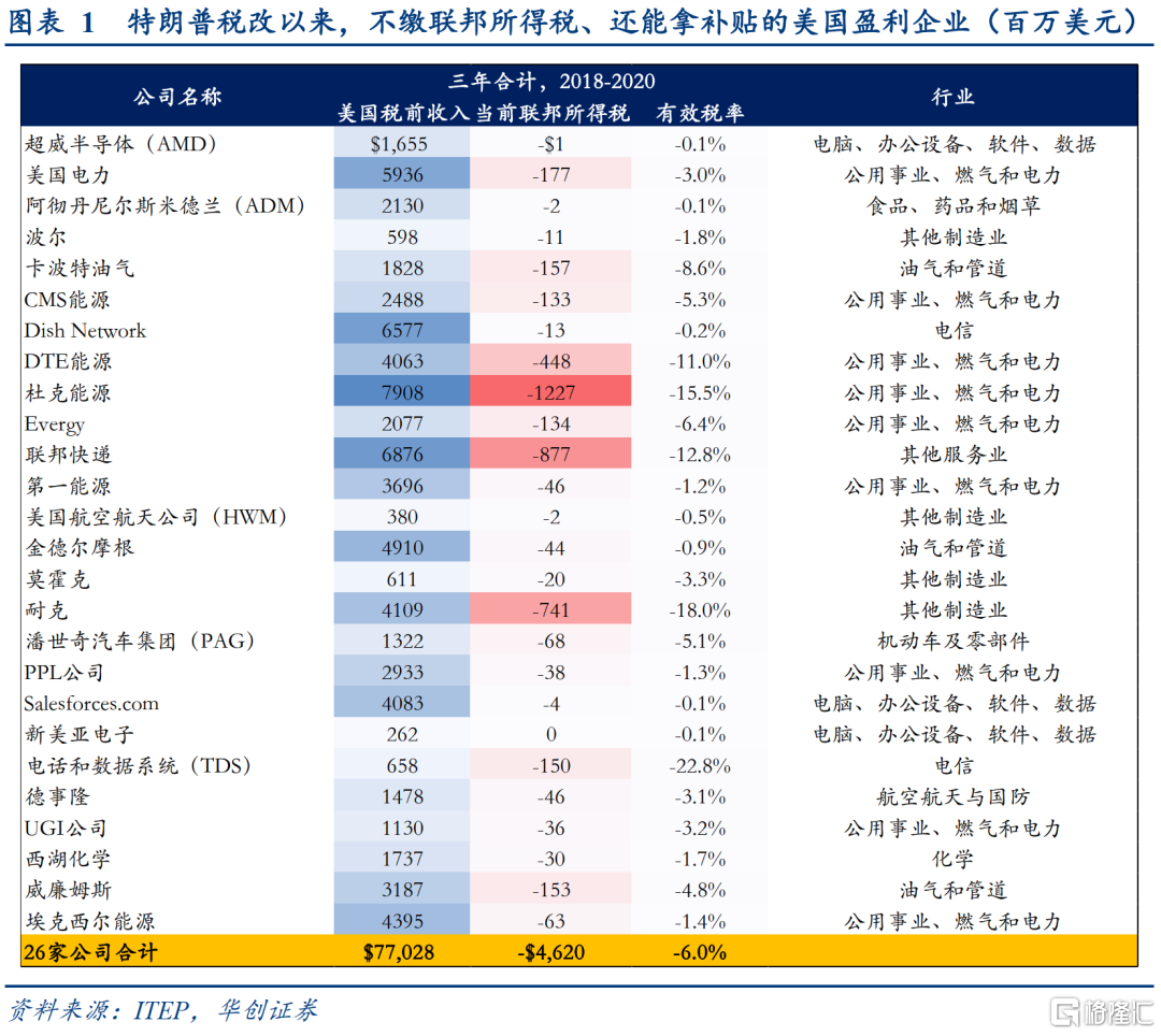 今年年初,拜登援引美國智庫稅收和經濟政策機構(ITEP)的研究顯示:包括亞馬遜、星巴克、網飛在內,《財富》世界500強企業中有91家在2018年未繳聯邦企業所得稅。自特朗普稅改以來,包括AMD、聯邦快遞、耐克在內,有26家美國盈利企業有效稅率爲負——不僅沒繳稅,還能拿補貼。