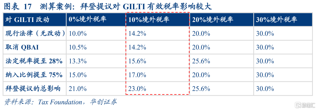 除了提升聯邦企業所得稅率外,拜登還計劃將美國跨國公司全球最低稅率的由10.5%提升至21%、並倡導國際稅收公平競爭——前者特指全球無形資產低稅收入(Global Intangible Low-Taxed Income,簡稱GILTI,下同);後者則通過OECD/G20框架下的支柱二(全球最低稅率)實現,G7協議已就設置至少15%的全球最低稅率達成共識。