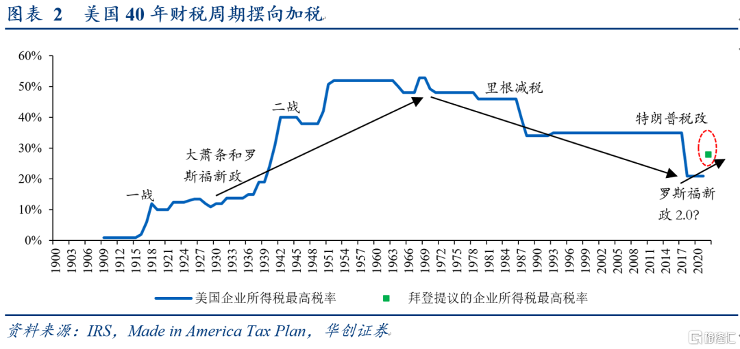 全球稅率潮起潮落的背後,是美國財稅週期如月球般的“引潮力”。“大蕭條”催生了1930年代的羅斯福新政,帶來了長達40年的美國“大政府”風潮和全球加稅浪潮;70年代的“滯脹”使凱恩斯主義走下神壇,80年代的裏根減稅不僅標誌着“小政府”登臺唱戲,更開啓了全球40年的減稅浪潮。而這一浪潮在號稱“裏根第二”的特朗普任上、以《減稅與就業法案(TCJA)》爲標誌達到高潮,行將以《美國製造稅收法案(Made in America Tax Plan)》爲句號,終結於“羅斯福第二”拜登之手——美國40年財稅週期擺向加稅,正在引領新一輪全球加稅浪潮的開啓。