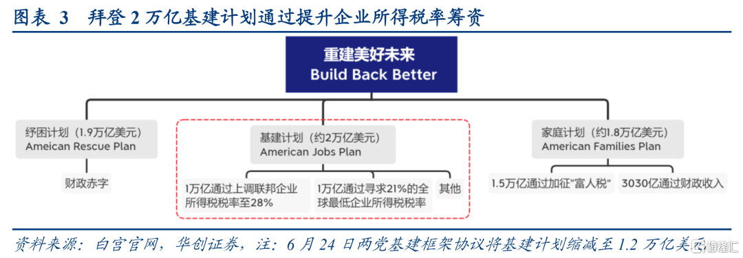 即便基建雄心打折,加稅決心依然堅定。6月24日,拜登宣佈達成1.2萬億美元兩黨基建框架協議,仍強調需要“更公平的稅收系統來支付全部基建費用”。