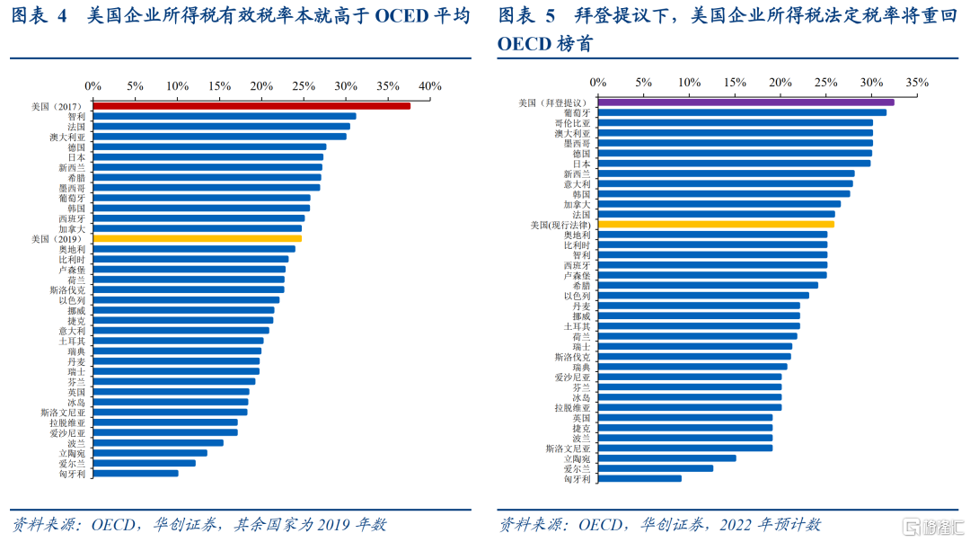 稅率不低,一體現在聯邦+州的“兩道稅”。美國是聯邦制國家,除了聯邦企業所得稅以外,各州平均企業所得稅率約在5%左右,2017年特朗普稅改前美國聯邦+州的有效企業所得稅率高達37.5%,高居OCED國家第一;即便特朗普稅改將聯邦企業所得稅由35%降至21%、同時各州企業所得稅率多爲不變或下調,2019年美國聯邦+州24.6%的有效稅率仍高於目前OECD平均水平;若拜登成功將企業所得稅提至28%,預計將使美國法定稅率在2022年升至32.2%,排名從OECD中遊重回第一。