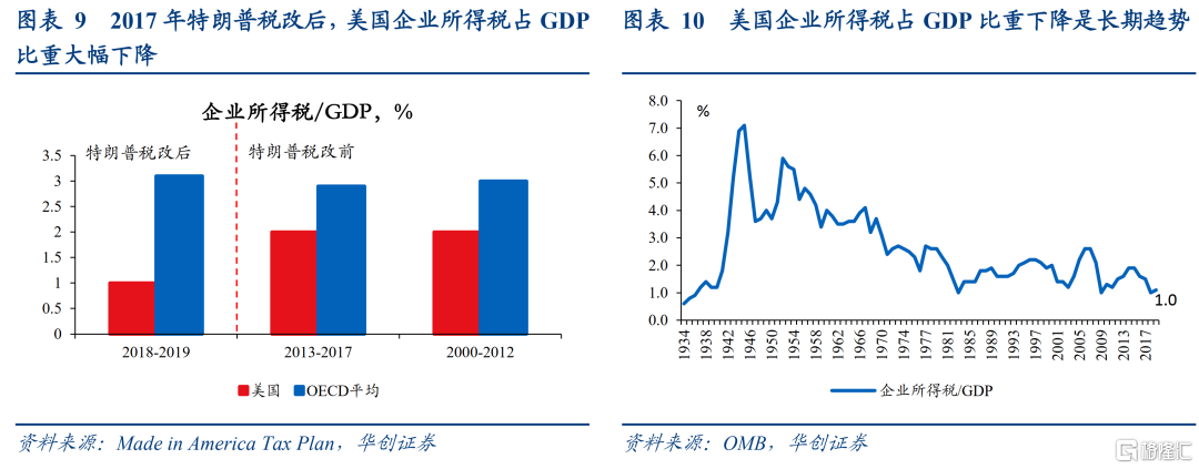 稅收不高,首先體現在美國企業所得稅佔GDP和財政收入的比重不高、且長期下降:2016年(特朗普稅改前)美國企業所得稅佔GDP的比重爲1.9%,低於OECD平均(2.9%),2019年(特朗普稅改後)該比重進一步降低至1.0%,拜登計劃將該比重恢復到約2%的特朗普稅改前水平。拉長來看,美國企業所得稅佔GDP的比重呈長期下降:二戰結束時該數字一度高達7.1%,而金融危機前的高點僅爲2.6%。