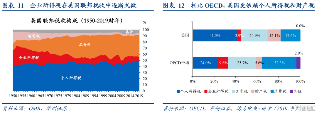 同樣的收縮態勢體現在財政收入的結構變化中:1950-2019財年間,企業所得稅在美國聯邦財政收入中的比重由1952財年的最高點32.1%下降至2019財年的僅6.6%,若將州考慮在內,2019年美國企業所得稅佔財政收入比重僅3.9%(OECD平均爲9.6%)——可見美國企業所得稅雖然稅率長期偏高,但實際籌集稅收的能力不強。