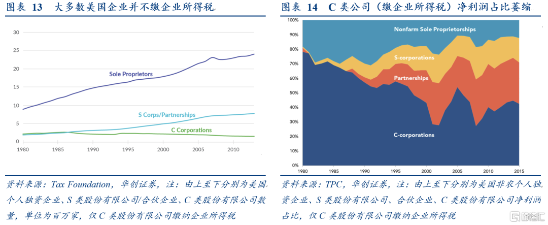 二是大多數美國企業實際上不繳企業所得稅,且這部分企業的數量和淨利潤佔比不斷增加。1980年代裏根降稅以來,美國個稅稅率的大幅降低使大量企業主選擇合夥、個人獨資、有限責任公司以及S類股份有限公司等不繳企業所得稅的公司形式,導致繳納企業所得稅的C類股份有限公司數量佔比已不足20%、淨利潤佔比已不到一半。