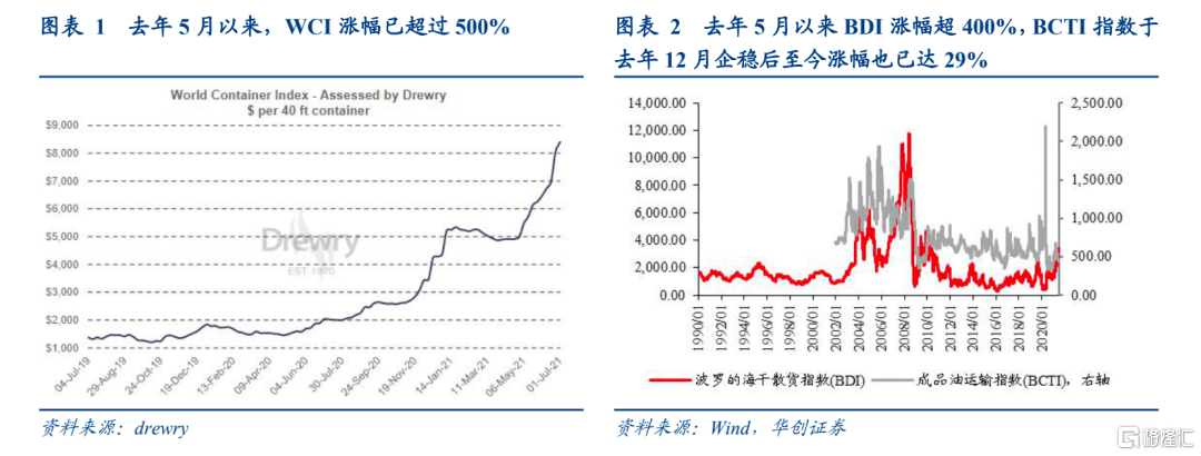 自去年疫情發生後至今,海上貨運價格快速上漲按照運輸貨物的不同,海上貨運主要分爲集裝箱運輸、幹散貨運輸和原油運輸。去年5月以來,衡量全球集運價的全球集裝箱指數(CTI)漲幅已超過500%,衡量全球幹散貨運價的波羅的海乾散貨指數(BDI)漲幅達到417%,衡量全球油運價的成品油運輸指數(BCTI)也在去年12月初企穩,至今上漲29%。