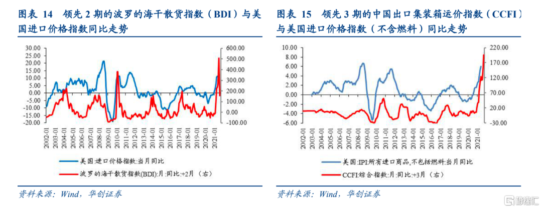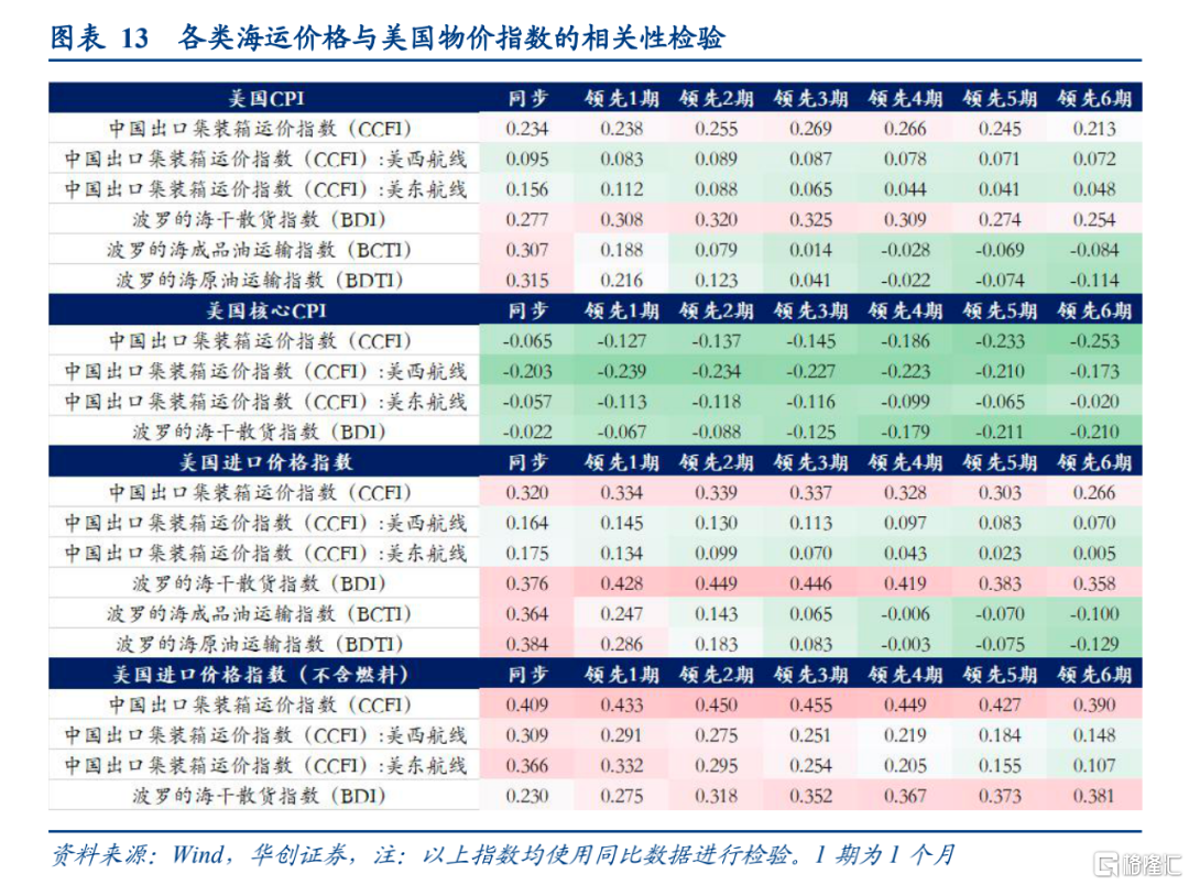 2)各類海運價格與美國通脹的相關性檢驗:海運價格與美國CPI和核心CPI同比走勢的相關性非常弱,領先2期的波羅的海乾散貨指數(BDI)同比與美國進口價格指數同比存在一定相關性,相關係數爲0.449;領先3期的中國出口集裝箱運價指數(CCFI)同比與美國進口價格指數(不含燃料)同比存在一定相關性,相關係數爲0.455