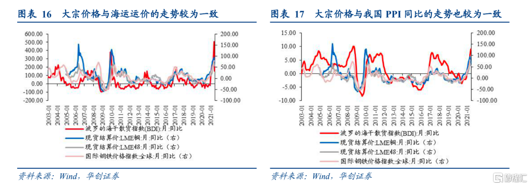 大宗品價格會從需求端影響海運運價,二者歷史走勢也較爲一致(圖16);而大宗品也是重要的輸入性通脹來源,比如銅價和鋼鐵價格與我國PPI同比的走勢也高度相關(圖17)。在實際操作中,我們很難將大宗商品價格的影響從海運運價與通脹的相關性走勢中剝離出來,並且下文的例子中也可以佐證,海運運價與通脹的強相關性走勢的原因大概率是二者都受大宗品價格漲跌的影響。這也意味着,海運運價與通脹的關係更多的是相關性而非因果性,可能無法從二者的相關性走勢中推導出海運運價會對通脹產生顯著影響的結論。