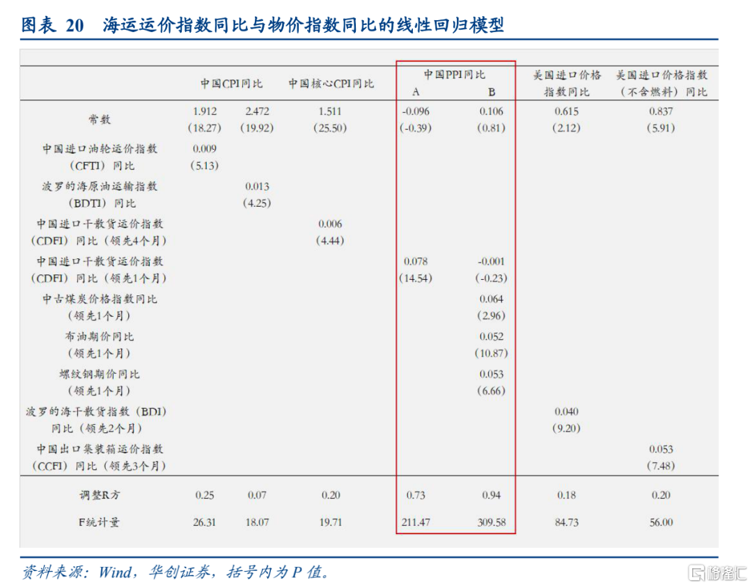 以中國進口乾散貨運價指數(CDFI)與PPI爲例。領先1個月的中國進口乾散貨運價指數(CDFI)同比與我國PPI同比的相關係數達到0.854,簡單地用OLS方法做線性迴歸模型,領先1個月的幹散貨運價指數(CDFI)同比對PPI同比的解釋力度達到0.73,且係數也十分顯著。但是當控制了煤、油、鋼等大宗品價格後,領先1個月的幹散貨運價指數(CDFI)同比的係數已經十分接近於0,並且也不顯著了。這個簡單的例子或許可能說明海運運價與通脹之前更多是相關性,而非因果性。