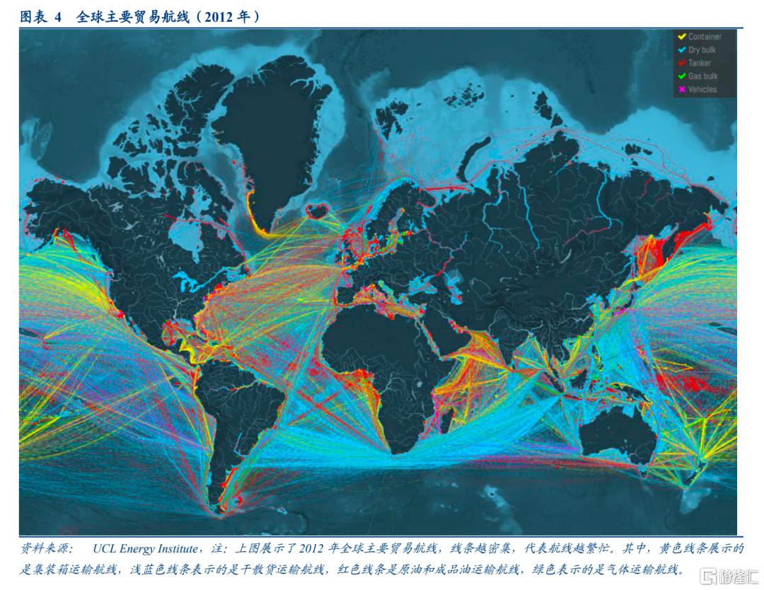 原油貿易航線: 主要來往於資源國-製造國和消費國,主要航線包括中東-遠東,中東-地中海-歐洲/北美,中東-好望角-歐洲/北美,西北歐-北美東海岸,西北歐-地中海-遠東,南美東海岸-好望角-遠東等。