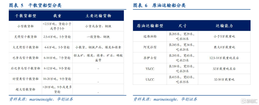 不同的航線和載重,也對應了不同的船型。集裝箱貿易航線的船型是集裝箱船,按照是否只用於集裝箱運輸,可分爲全集裝箱船、部分集裝箱船、可變換集裝箱船;幹散貨船按照載重不同可分爲小型散貨船、靈便型/大靈便型散貨船、巴拿馬型/後巴拿馬型散貨船、好望角型散貨船(圖5);原油運輸船同樣按照載重分類,可分爲近海油輪、阿芙拉型、蘇伊士型、VLCC、ULCC型油輪(圖6)。