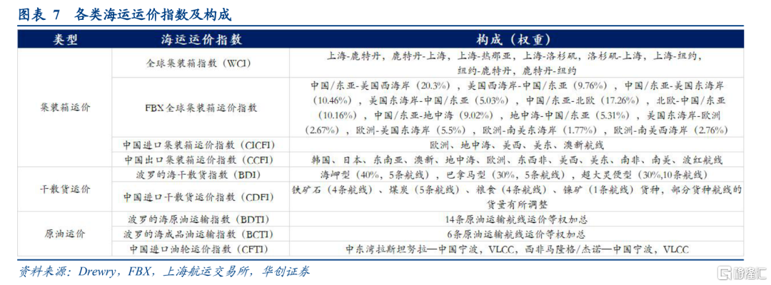 首先是集裝箱運價指數,衡量全球集裝箱運價的主要有全球集裝箱指數(WCI,包括8條航線)、FBX全球集裝箱運價指數(包括4條航線),國內的主要有中國進口集裝箱運價指數(CICFI,包括5條航線)、中國出口集裝箱運價指數(CCFI,包括14條航線,實際公佈12條航線運價)。